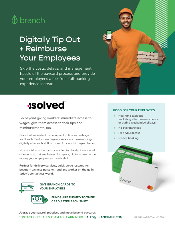 Branch helps businesses modernize their payment methods to empower working Americans. isolved customers can leverage Branch at no cost to offer instant digital tip, replace legacy paycards, provide fee-free debit cards and banking to employees, allow direct deposits for all workers, and Earned Wage Access (EWA).